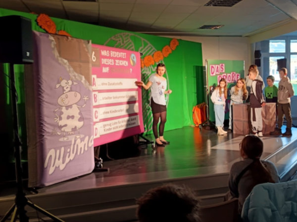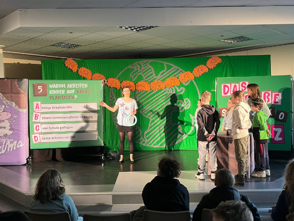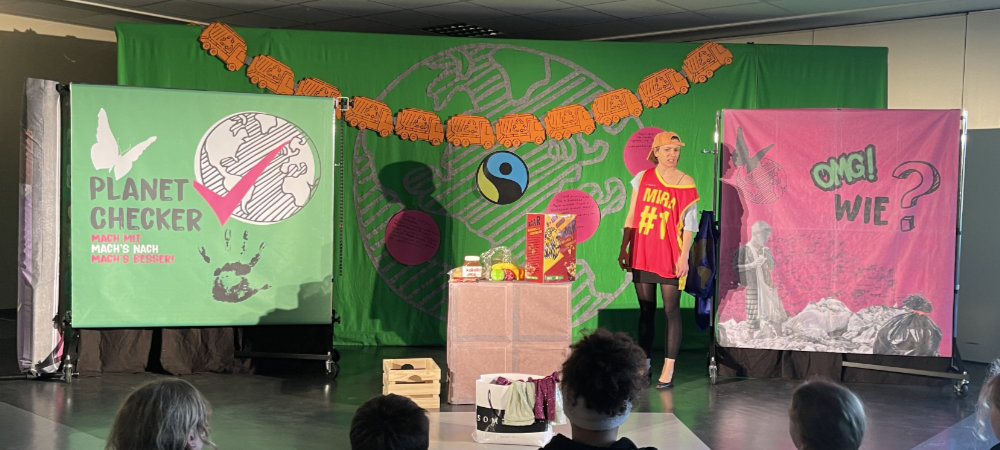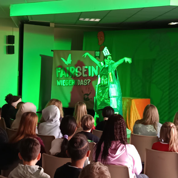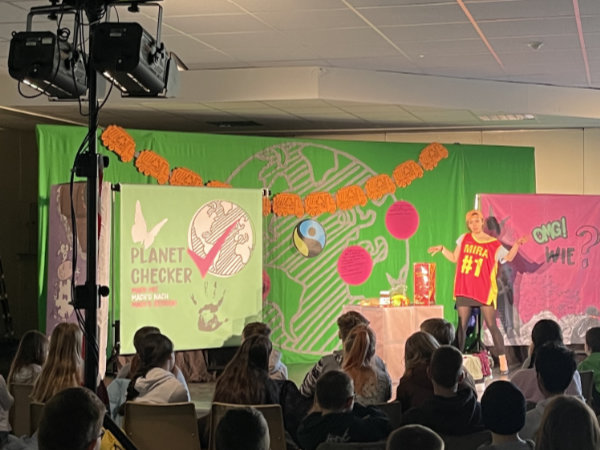 Bei der turbulenten und abwechslungsreichen Eine-Frau-Show des „Theaters Sonni Maier“ mit Theaterszenen, Songs, kreativen Mini-Vorträgen und interaktiven Publikumsspielen drehte sich alles um das Thema Globale Gerechtigkeit. Die Schauspielerin Agnes Fischer nahm ihr Publikum mit auf eine Reise um die Welt und besucht dabei zahlreiche Orte, an denen die Ungleichheit den Grund- und Oberschüler:innen besonders deutlich wurde: Eine Müllkippe in Ghana, wo der Technikschrott aus deutschen Kinderzimmern landet, ein Sweatshop in Bangladesch, wo Kinderarbeit ganz normal ist oder eine Kakaoplantage in der Elfenbeinküste, wo die Kinder sogar als Sklaven schuften müssen. Als Gegenentwurf zu dieser düsteren Realität entwickelte die Darstellerin gemeinsam mit ihrem Publikum eine andere, gerechtere Welt. Dabei war jede:r einzelne gefragt, sich aktiv einzubringen und zusammen mit den anderen nach praktischen Wegen hin zu einer faireren Welt zu suchen.