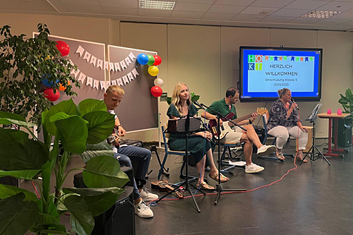 Schüler:innen der Jahrgangsstufe 6 und 7 begrüßten die neuen Fünftklässler:innen mit einer Tanzchoreographie (Leitung: Annelie Balduff). Auch war wieder die "Hoki-Band" im Einsatz (Lehrerband: Laura Popken, Antje Schropp, Reent Müller und Eike Eden) Sie gestaltete musikalisch das Rahmenprogramm der Einschulungsfeier mit.