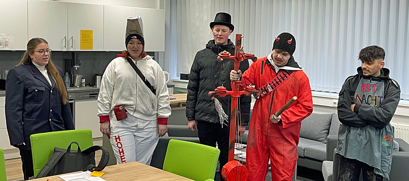 So besuchten die "Schwarzmacher" auch die Oberschule Hohenkirchen und warteten schon vor dem Morgengrauen lärmend an der Bushaltestelle auf unsere Schülerinnen und Schüler, um ihre Gesichter zu schwärzen. Das närrische Treiben endete in der zweiten großen Pause mit dem Fastnachtslied im Lehrerzimmer.