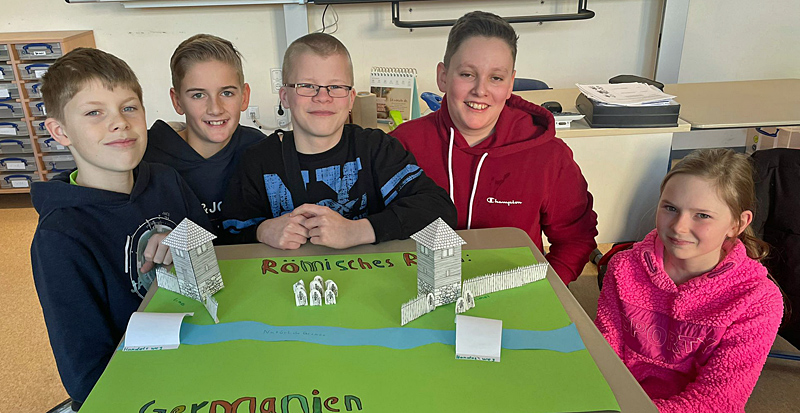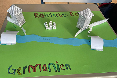 Im Geschichtsunterricht der Klasse 6a erstellte eine Schülergruppe ein Modell des Limes, der ehemaligen Grenzbefestigung zwischen dem Römischen Reich und Germanien. Während der Klassenfahrt des 6. Jahrgangs im vergangenen November wurde das Museum der Varusschlacht in der Nähe von Osnabrück besucht, wo den Römern eine der schlimmsten Niederlagen von den Germanen zugefügt wurde, bei der zehntausende Opfer zu beklagen waren. Im Geschichtsunterricht der Klasse 6a wurde dies mit diesem Modell weiter vertieft, um darzustellen, dass es auch ein friedliches Zusammenleben mit regem Handel am Limes gab. Zu sehen sind zwei römische Wachtürme und eine Befestigung aus Palisaden sowie einige römische und germanische Figuren an den Grenzanlagen.