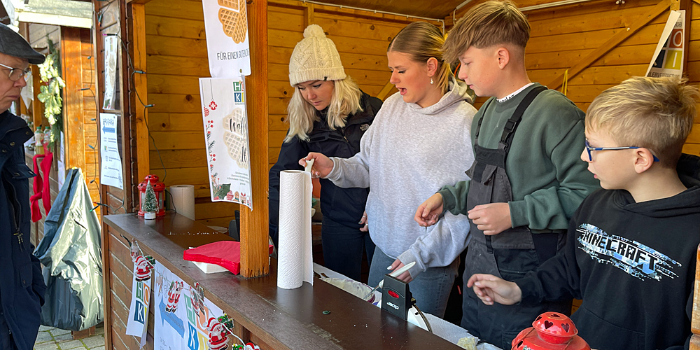 Auch in diesem Jahr konnte die Oberschule Hohenkirchen, unterstützt von der Schüler:innenvertretung (SV) und der Elternschaft, wieder eine Bude auf dem Weihnachtsmarkt in Hohenkirchen bestücken. Es wurde erneut viel Waffelteig gespendet und zahlreiche Dekoartikel der Profilfächer und der Schülerfirma "Feinschliff" angeboten. Dank vieler freiwilliger Helfer:innen, die ihre Dienstzeiten pünktlich und zuverlässig durchführten, war der Verkauf wieder ein voller Erfolg.