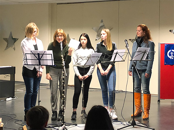 Neben Gedanken zur Leitfrage: „Was ist Frieden?“, die Schülerinnen und Schüler der 7a formulierten, fanden zwei Auftritte der Chor-AGs von Tatjana Glazer stimmungsvollen Raum. An die Wichtigkeit des Frieden-Schaffens, im Allgemeinen wie gerade in Kriegszeiten, wurde durch die „Geschichte von der Silberkugel“ erinnert.