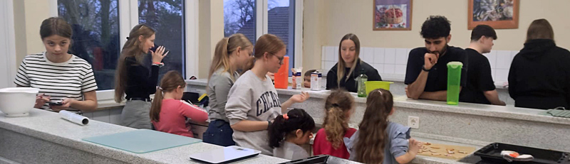 Am 13.12. wurde es in der Lehrküche der Oberschule Hohenkirchen immer lauter. Die 14 Grundschüler:innen der 1b waren zunächst ein wenig eingeschüchtert von 8 richtig großen Zehntklässler:innen aus dem Unterricht geholt zu werden um gemeinsam Kekse zubacken.