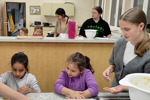 Unsere Zehntklässler:innen waren auch zunächst sehr ruhig, da sie so aufgeregt waren: Im Rahmen des Profilunterricht Gesundheit und Soziales liegt im 10. Jahrgang in diesem Halbjahr thematisch der Schwerpunkt auf Sozialpädagogik. Nachdem wir uns mit unter anderem mit Erziehungsstilen, Erziehungsmitteln und Aufgaben von Erzieher:innen beschäftigt haben, sollten die Großen ein Angebot für die Kleinen planen, also Gelerntes in die Tat umsetzen. Bereits einen Tag vorher wurde der Teig zubereitet, alles aufgebaut und vorbereitet.