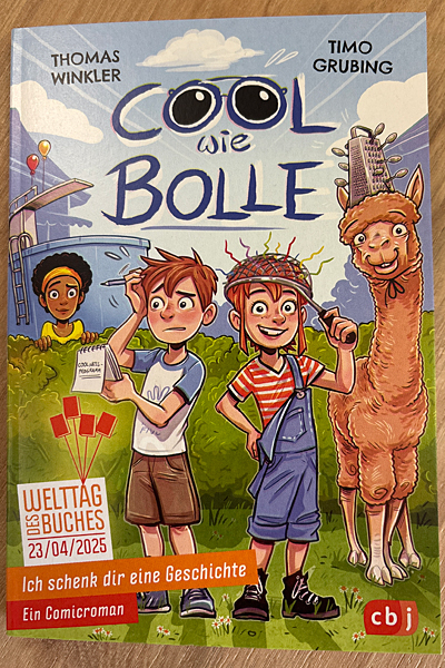Alle Schüler:innen haben am Ende des Besuchs das Buch „Cool wie Bolle“ von Thomas Winkler geschenkt bekommen, das in den kommenden Deutschstunden gemeinsam gelesen und erarbeitet wird.