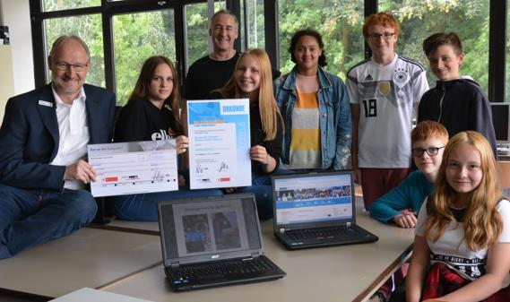 Die Oberschule Hohenkirchen ist Preisträger beim Wettbewerb "Ran an den Computer". Die Schülerinnen und Schüler nahmen am 06.06.2016 das Preisgeld in Höhe von 500 Euro entgegen. Den symbolischen Scheck und eine kleine Urkunde überreichte am Montag der Filialleiter der LzO Hohenkirchen Ralf Siebert. Das Projekt "Schüler schulen Senioren" wurde von der Initiative des Landes n-21 (Schulen in Niedersachsen online) initiiert und von den Sparkassen finanziell unterstützt. Die Oberschule Hohenkirchen führt das Projekt „Ran an den Computer – Schüler schulen Senioren“ bereits seit gut zehn Jahren durch. Seit zwei Jahren gibt es eine Kooperation mit der Volkshochschule Friesland-Wittmund, die das Angebot in ihr Programmheft aufgenommen hat. Einmal im Monat kommen Senioren, um sich von unseren VHS-Kursleiterinnen und -leitern den Umgang mit dem PC und Tricks und Kniffe erklären zu lassen. Die Schülerinnen und Schüler um Informatiklehrer Heiko Hinrichs helfen den Senioren aber auch bei speziellen Problemen mit ihrem PC. (Foto: Rahel Arnold; Quelle: NWZ)