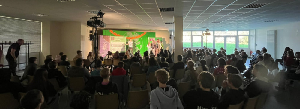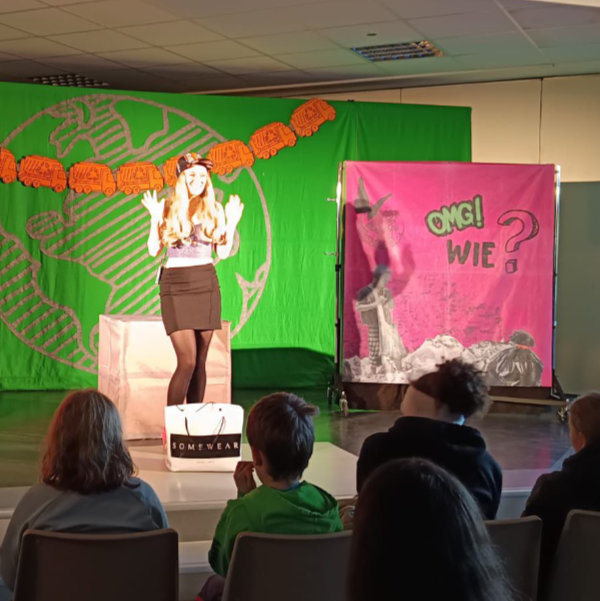 Bei der turbulenten und abwechslungsreichen Eine-Frau-Show des „Theaters Sonni Maier“ mit Theaterszenen, Songs, kreativen Mini-Vorträgen und interaktiven Publikumsspielen drehte sich alles um das Thema Globale Gerechtigkeit. Die Schauspielerin Agnes Fischer nahm ihr Publikum mit auf eine Reise um die Welt und besucht dabei zahlreiche Orte, an denen die Ungleichheit den Grund- und Oberschüler:innen besonders deutlich wurde: Eine Müllkippe in Ghana, wo der Technikschrott aus deutschen Kinderzimmern landet, ein Sweatshop in Bangladesch, wo Kinderarbeit ganz normal ist oder eine Kakaoplantage in der Elfenbeinküste, wo die Kinder sogar als Sklaven schuften müssen. Als Gegenentwurf zu dieser düsteren Realität entwickelte die Darstellerin gemeinsam mit ihrem Publikum eine andere, gerechtere Welt. Dabei war jede:r einzelne gefragt, sich aktiv einzubringen und zusammen mit den anderen nach praktischen Wegen hin zu einer faireren Welt zu suchen.